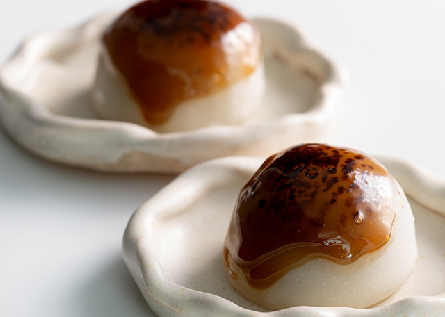 もっちり弾力のある餅で、甘じょっぱいみたらしタレとつぶ餡を包みました。