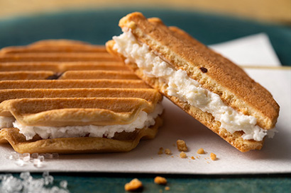 サクっと口ほどけのよい、バターの風味豊かなヴァッフェルに、なめらかな口どけのシュガークリームをはさみました。