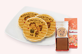 オリジナルデザインでお作りする千寿せんべいはデザインが見える可愛らしいお箱にお入れします。