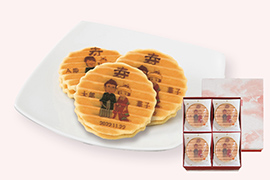 ご婚礼用の専用箱は、紅白で飛鶴をほどこしたおめでたい特別仕様です。ご結婚式での引菓子に「最適な」5枚入りから、お祝いや内祝いにもおつかいいただける16枚入りまでご用意しています。