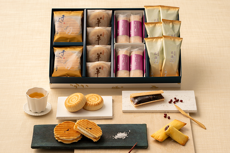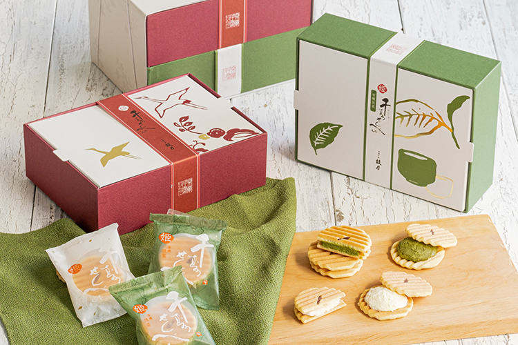 プレミアム千寿せんべいをはじめとする定番の銘菓から、季節の風情を映した上生菓子まで、贈る相手やシーンに合わせてお選びいただける豊富なラインナップをご用意しております。