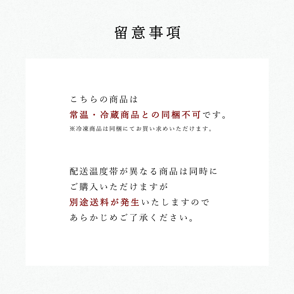 別温度帯商品(常温・冷蔵便)との同梱配送はできません。