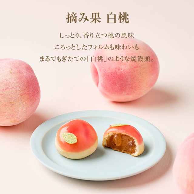 | 桃の果肉がごろっと入った果汁たっぷりの特製白桃餡をしっとりやわらかい生地で包み込みました。 シャキシャキとした果肉感とジューシーな風味がやさしく溶け合います。 |